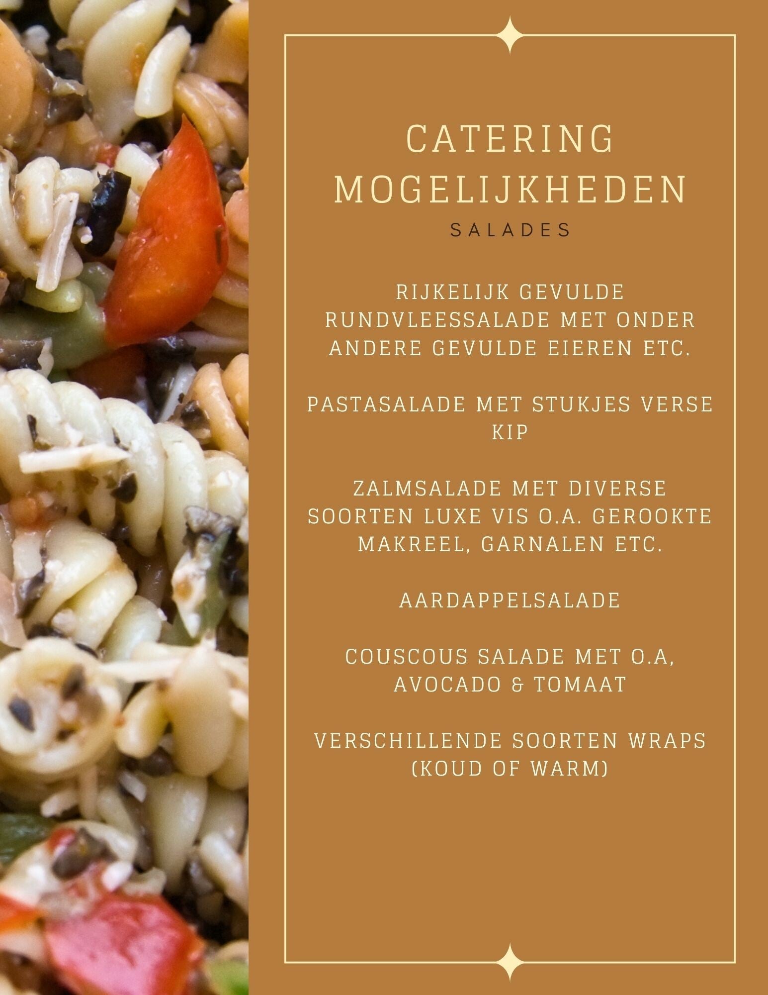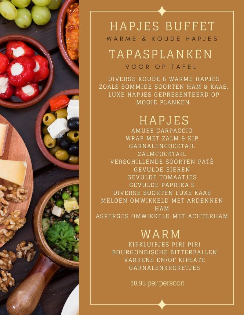 We hebben warme en koude buffetten, een walking dinner, hapjesbuffet, uitgebreide lunchmenu's, barbecues (zelfs winterbarbecues voor in de zaal).